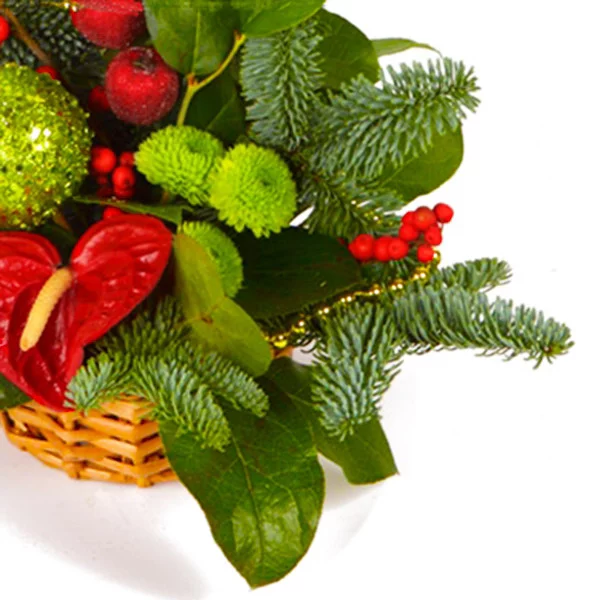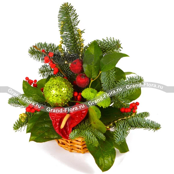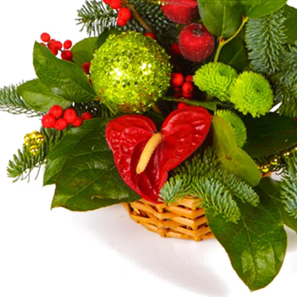 Искрящаяся праздничная композиция с зелеными декоративными яблоками и красным антуриумом.