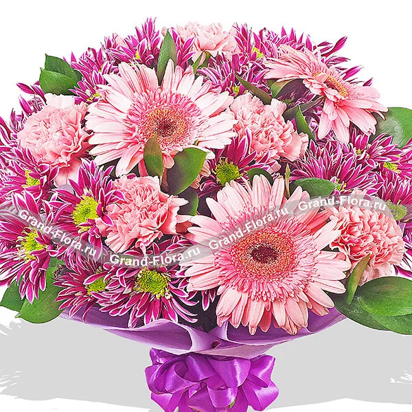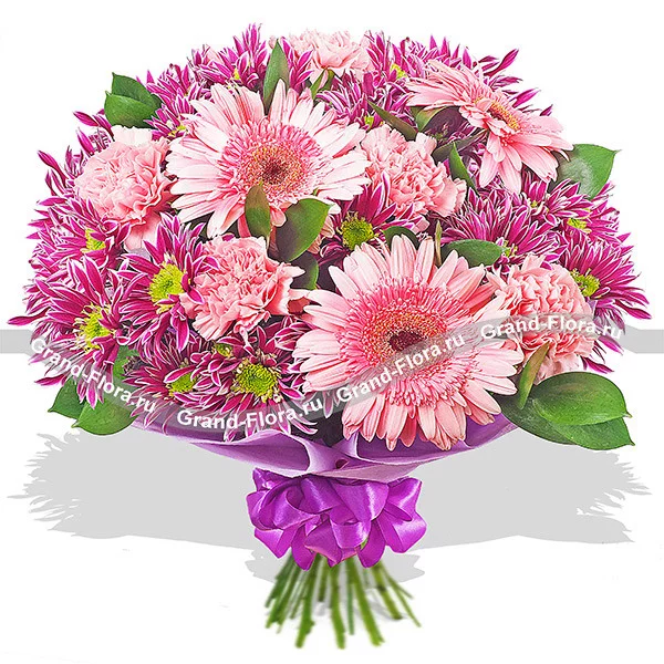 Стандартный (на фото): гербера розовая - 3 шт., гвоздика одноголовая розовая - 6 шт., хризантема кустовая фиолетовая - 4 шт., рускус, фетр фиолетовый.