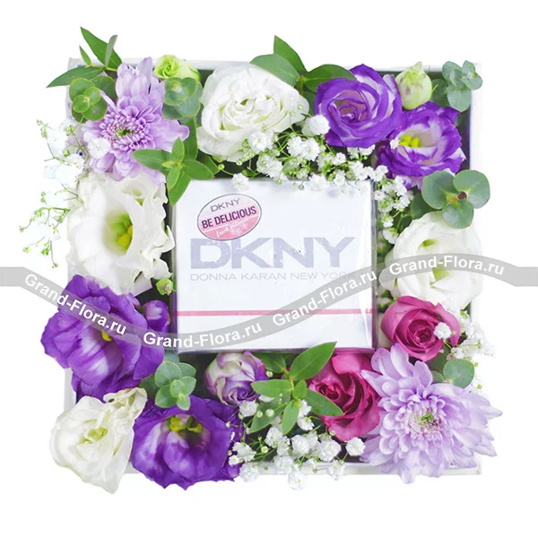 Стандартный: эустома фиолетовая  -1 шт., эустома белая - 1 шт., хризантема фиолетовая кустовая - 1 шт.,роза розовая - 2 шт., эвкалипт, зелень, гипсофила., парфюм DKNY "Be Delicious Fresh Blossom EDP" - 30 ml., оазис, коробка.