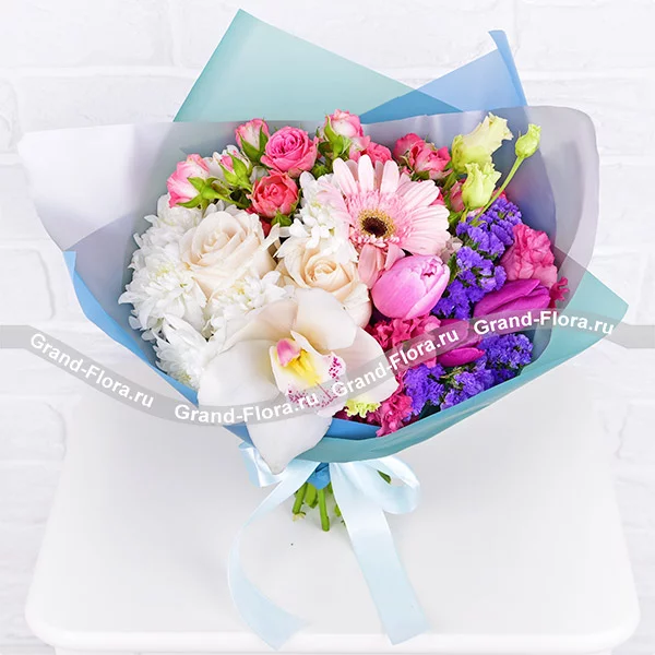 Стандартный: орхидея белая - 1 шт., гербера розовая - 1 шт., роза белая - 2 шт., хризантема кустовая белая - 2 шт., эустома розовая - 2 шт., роза кустовая розовая - 2 шт., тюльпан розовый - 1 шт., тюльпан фиолетовый - 2 шт., статица, упаковка, лента.Примерный размер: 30Х30 см.
